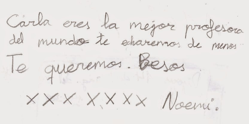 Hui Carla ens deixa, se'n torna a la Universitat per acabar la seua carrera de MESTRA. Ha estat amb nosaltres des del dia 2 de Febrer i ens deixa un bon record perquè ens ha ajudat a millorar. Nosaltres també l'hem ajudat, perquè en tots aquests mesos s'ha pogut donar compte del que és una escola de veritat i com es pot treballar amb xiquets i xiquetes tan diferents dia a dia. Ha pogut conéixer una escola per dins, en viu i no només mitjançant els llibres.